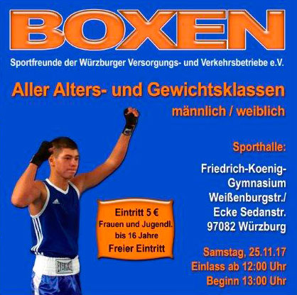 in 97082 Würzburg-Zellerau, Friedrich-Koenig-Gymnasium, (Weißenburgerstraße/Ecke Sedanstraße) eine Nachwuchsveranstaltung in allen Alters- und Gewichtsklassen (männlich/weiblich/Breitensport) aus.